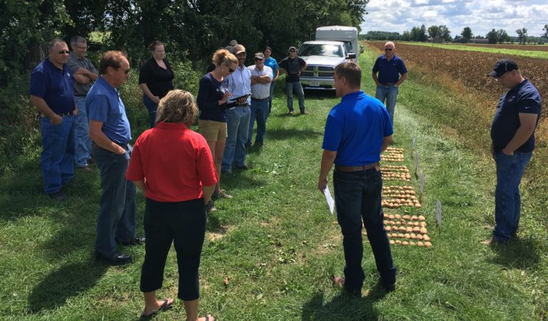 The SpudPro committee of the Wisconsin Potato and Vegetable Growers Association (WPVGA) meets 2-3 times per year to discuss new varieties coming out of the breeding program. This summer we met in a Plover-area hotel for the business meeting and then headed to Plover River Farms, where Mike Copas (Senior Agronomist, RPE) discussed some preliminary results from a trial comparing our advanced breeding line W9133-1rus against the leading fresh market russet varieties, Goldrush and Russet Norkotah.