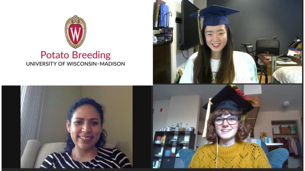Peyton Sorensen (B.S. Horticulture) has worked in the lab as an undergrad for several years and will continue as an MS student, researching marker-assisted selection in tetraploid and diploid potato. Lin Song (M.S. Plant Breeding & Plant Genetics) successfully defended her thesis on “Evaluations of F1, F2, and F3 Generations of Diploid Potato” and will continue as a PhD student. Maria Caraza-Harter (Ph.D. Plant Breeding & Plant Genetics) successfully defended her thesis on “Genetics of Skin Set and Color in Red Potatoes” and will continue as a postdoc in the lab. Due to the COVID-19 pandemic, we could not celebrate their graduation in person, so we settled for a virtual group photo: